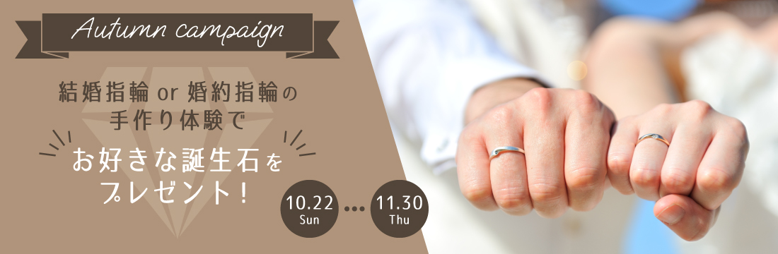 2023/10/22(日)〜11/30(木)の期間中に、富山宝石工房にて結婚指輪または婚約指輪の⼿作り体験をご成約のお客様にお好きな誕⽣⽯を指輪1本につき1種類プレゼント!